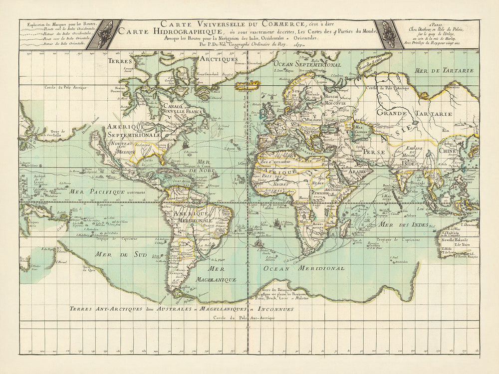 El diseño y estilo de este mapa son tan cautivadores como su contenido. La inclusión de cuatro barcos meticulosamente ilustrados por parte de Du Val añade un elemento dinámico y aventurero, simbolizando las hazañas marítimas de la época. La proyección cartográfica del mapa y el intrincado detalle de las rutas comerciales subrayan su uso práctico para la navegación. Los mares y océanos están elegantemente etiquetados, desde el Mer Pacifique hasta el Mer de Tartarie, guiando al espectador a través de las vastas vías marítimas del mundo.