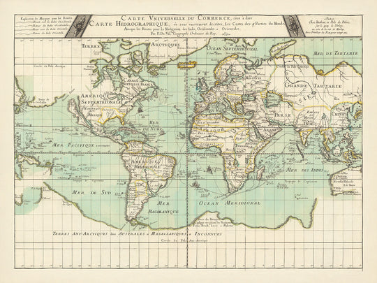 Cada región y continente se presenta con una mezcla de precisión y fantasía imaginativa, reflejando la combinación de conocimiento empírico y mito de la época. Europa, Asia, África y las Américas están todas destacadas, junto a las tierras fantásticas de Grande Tartarie y los reinos míticos en la Antártida. Esta yuxtaposición de lo conocido y lo desconocido ofrece una rica narrativa de descubrimiento y especulación, capturando la esencia de la cartografía del siglo XVII.