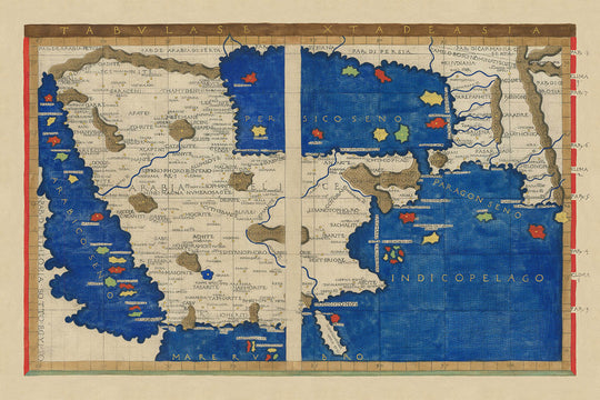 La visión de Berlinghieri era tanto académica como artística. A diferencia de sus contemporáneos, imbuyó sus mapas con costas dinámicas y cordilleras fluidas, reflejando un mundo vivo con movimiento y posibilidad. La Península Arábiga emerge aquí en una forma distintivamente ptolomeica, sus contornos estirados y moldeados por las limitaciones y aspiraciones del conocimiento clásico. Sin embargo, dentro de este marco, el arte de Berlinghieri brilla: los ríos serpentean desde los macizos centrales hacia costas distantes, los archipiélagos se agrupan cerca del estrecho de Ormuz, y las costas del Mar Rojo y del Golfo Pérsico undulan con una gracia casi pictórica. Este es un mapa donde el mito y la realidad se entrelazan, donde el mundo conocido se encuentra con lo legendario.