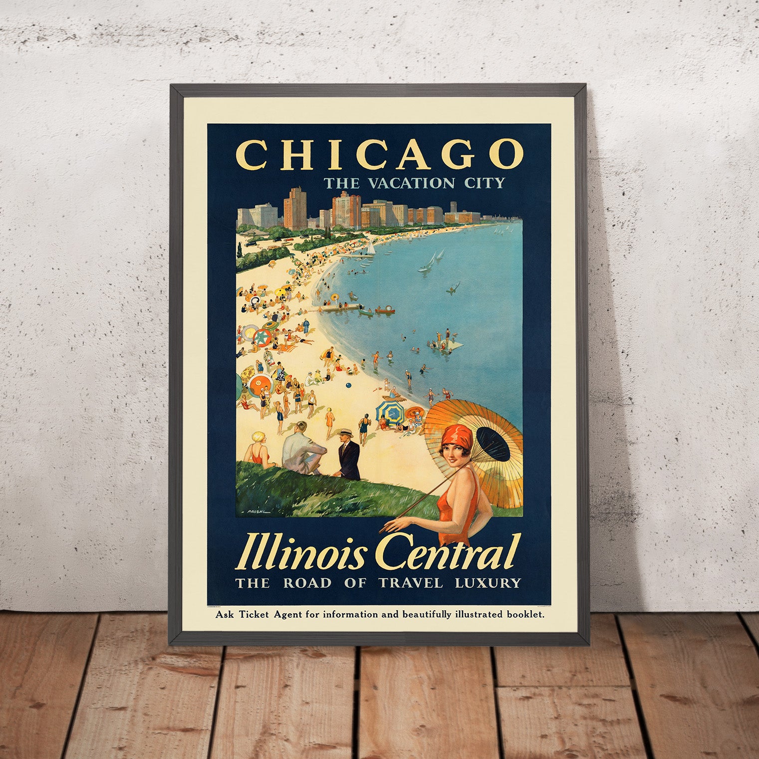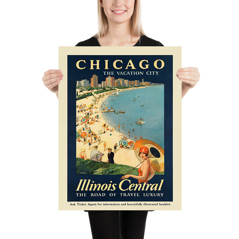 Chicago. The Vacation City by Paul Proehl invites you to the sunlit shores of Lake Michigan at the height of the Art Deco era. Commissioned for the Illinois Central Railroad, this classic travel poster sells the city as a breezy beach resort: the headline CHICAGO THE VACATION CITY crowns a sweeping view of the curving lakefront, lively with umbrellas and sailboats, and a smartly dressed bather in an orange swimsuit and parasol in the foreground. The message at the base—Illinois Central: The Road of Travel Luxury—captures the glamour of American rail travel when Chicago was the nation’s stylish gateway to the Midwest.