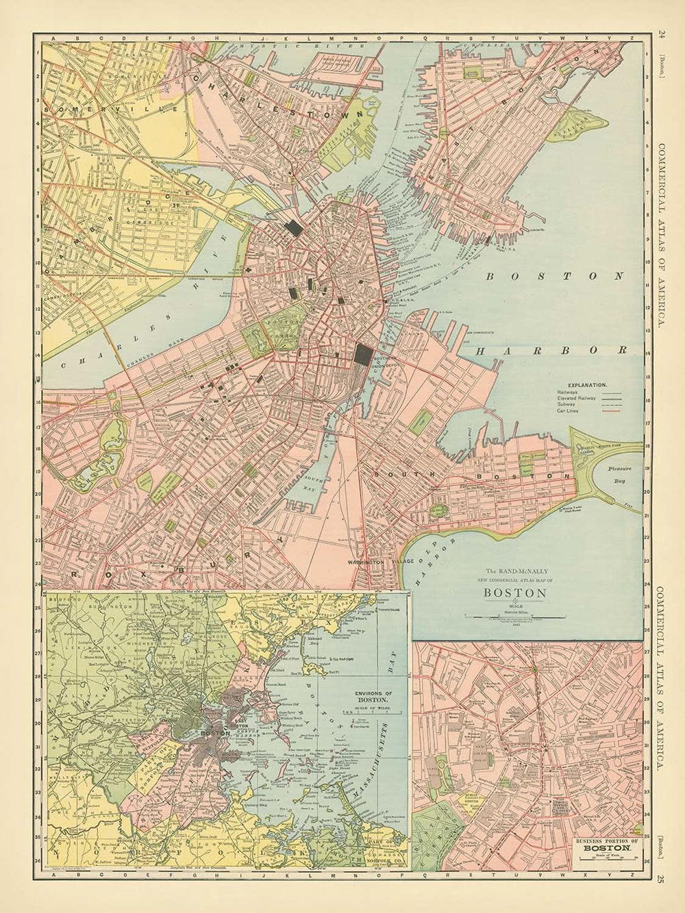 - Mapas insertados: Boston y alrededores, sector comercial de Boston