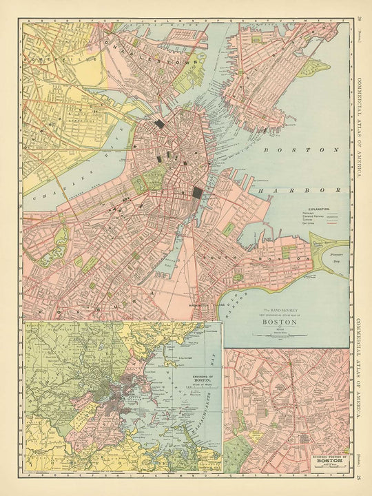 Rand McNally & Company, conocida por su precisión y maestría en cartografía, da vida a Boston con este mapa. Su reputación de crear algunos de los mejores mapas atlas de gran formato de la época es evidente en el meticuloso detalle y la claridad que presentan. Este mapa no solo traza las calles de la ciudad, sino que también captura la esencia del dinámico crecimiento de Boston y su papel como centro de comercio y cultura.