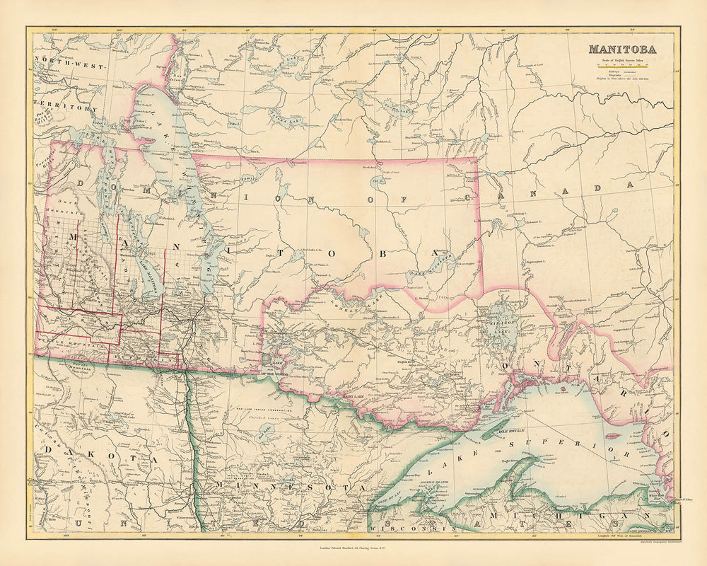 Sumérgete en la rica historia del paisaje canadiense con el "Mapa de Manitoba" elaborado por el estimado cartógrafo John Arrowsmith en 1884. Este exquisito mapa es un testimonio de la habilidad inigualable de Arrowsmith y su dedicación al detalle, mostrando el Dominio de Manitoba en un período de crecimiento y desarrollo significativo. El mapa es parte del Atlas de Londres de Geografía Universal de Stanford, una colección prestigiosa que captura las divisiones físicas y políticas del mundo durante el siglo XIX. Cada división administrativa está meticulosamente delineada, ofreciendo un vistazo al pasado y al intrincado tapiz de los asentamientos en expansión y las redes de transporte de Manitoba.