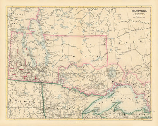 Mapa antiguo de Manitoba por Arrowsmith, 1884: Winnipeg, Río Rojo, Lago Winnipeg, Ferrocarriles, Fronteras