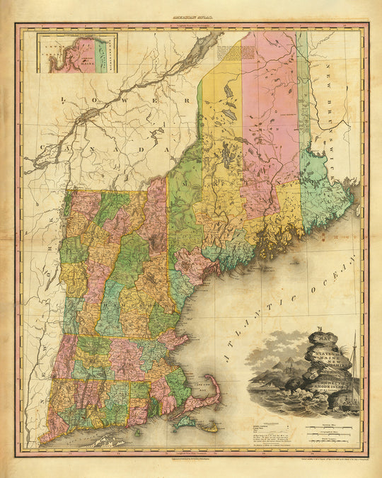 Retroceda en el tiempo con esta exquisita reproducción del "Old Map of New England" del famoso cartógrafo H. S. Tanner. Publicado en 1820, este mapa meticulosamente detallado captura los límites históricos de Maine, New Hampshire, Vermont, Massachusetts, Connecticut y Rhode Island. Sumérjase en la rica historia de la región mientras explora los asentamientos, condados y maravillas naturales que definieron Nueva Inglaterra durante esta época crucial. Si es usted un ávido historiador, un entusiasta de la cartografía o simplemente aprecia el arte de los mapas antiguos, esta pieza no puede faltar en su colección.