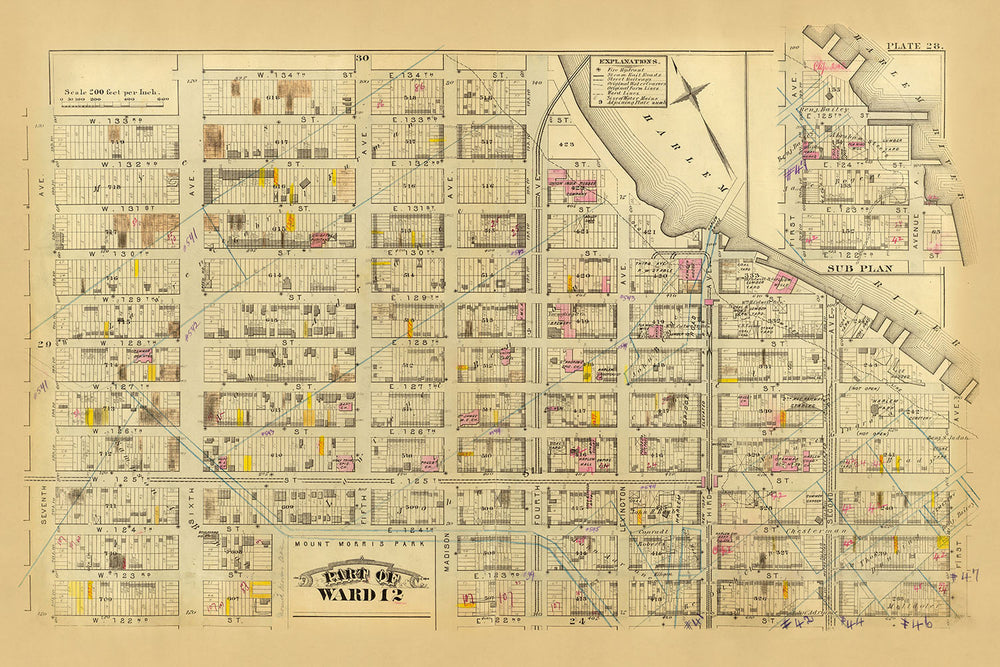 Una de las características destacadas de este mapa es su representación de Mount Morris Park, un importante espacio verde que ha servido como un área recreativa vital para los residentes. La inclusión del parque resalta la importancia de los espacios públicos en la planificación urbana durante este período. Además, el mapa ilustra el río Harlem, una vía fluvial crucial que ha desempeñado un papel fundamental en el transporte y el desarrollo económico de la ciudad. La presencia del río subraya la interconexión de los entornos naturales y construidos de la Ciudad de Nueva York.