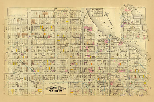 El mapa también presenta un plano subyacente, añadiendo otra capa de profundidad a su narrativa histórica. Este plano proporciona una mirada más cercana a secciones específicas del Distrito 12, permitiendo un examen más granular de las divisiones de propiedad y el uso del suelo. La codificación por colores utilizada para diferenciar entre propiedades residenciales y comerciales mejora aún más la utilidad y el atractivo estético del mapa. Este elemento de diseño reflexivo refleja el compromiso de Bromley de crear mapas que sean tanto informativos como visualmente impactantes.