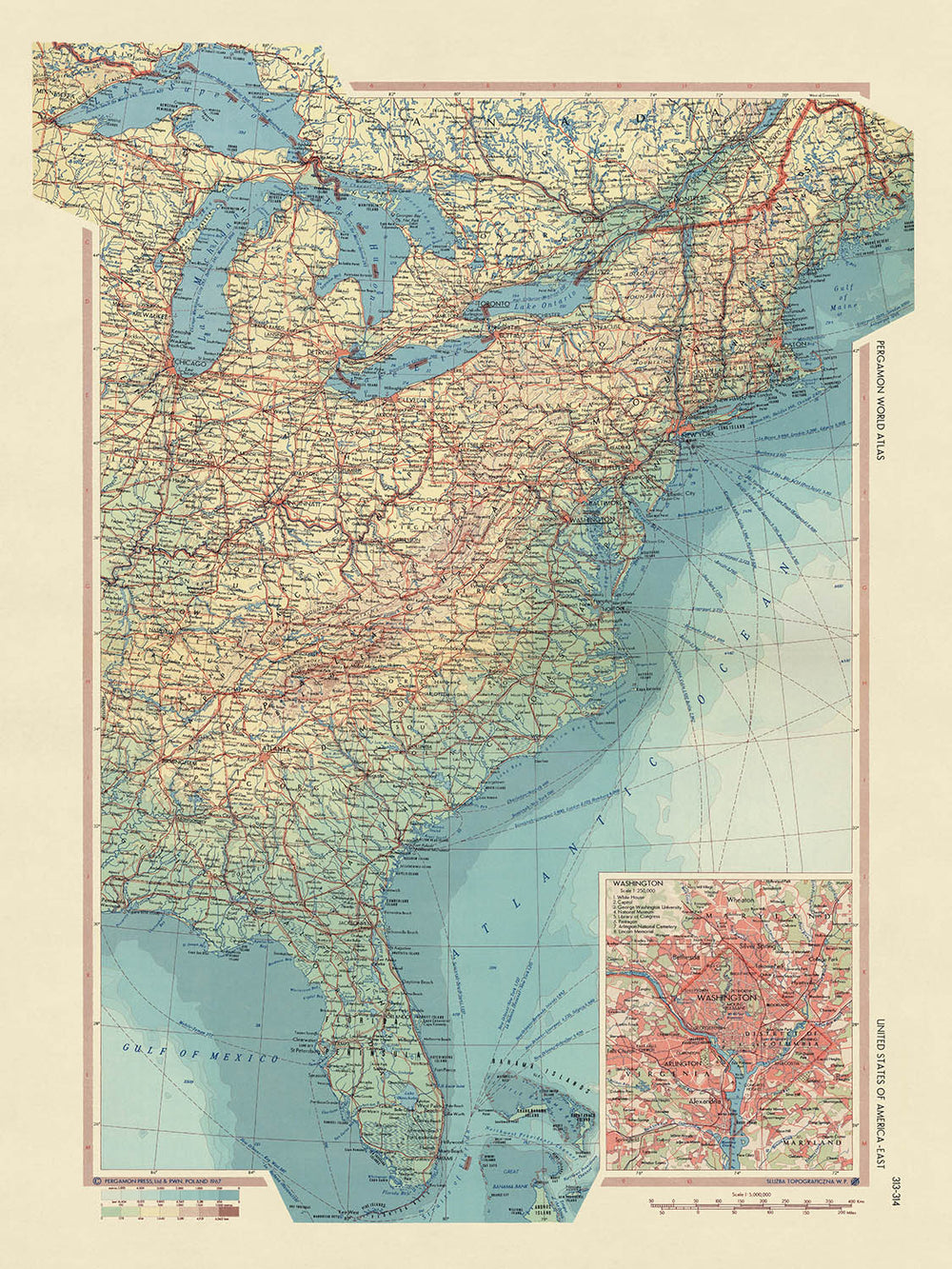 El mapa está meticulosamente elaborado, mostrando las habilidades cartográficas del Servicio de Topografía del Ejército Polaco. Sus características políticas y físicas detalladas proporcionan una visión completa de la topografía de la región, incluyendo cadenas montañosas, ríos, lagos y ciudades. El mapa también incluye un recuadro de Washington D.C., proporcionando una mirada más cercana a la capital de la nación.