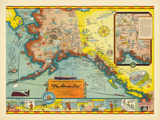 Edward Camy, un maestro de los mapas pictóricos, infundió esta creación con humor y encanto, reflejando el espíritu aventurero de la época. Su trabajo se caracteriza por su diseño atractivo, que combina información práctica con visuales entretenidos. El mapa incluye un recuadro de la ruta del ferrocarril de Alaska, ilustrando la conectividad entre Seward y Fairbanks, y presenta la Richardson Automobile Highway, enfatizando las crecientes redes de transporte de la época.