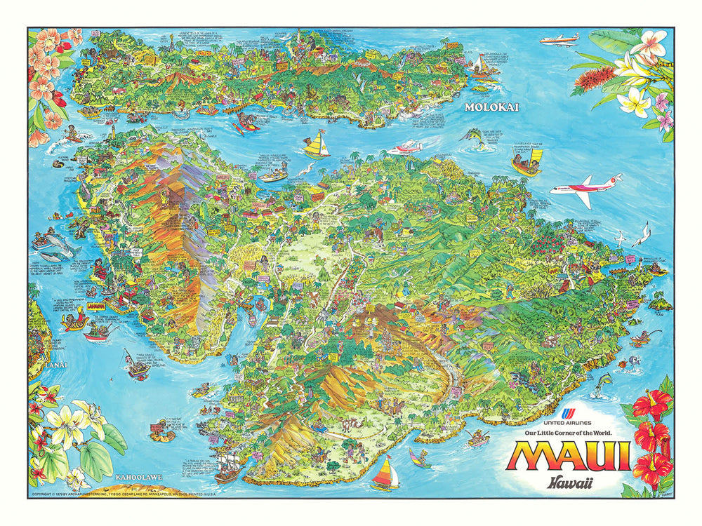 Antigua Mapa Pictórico de Hawái por Forrest, 1979: Kahului, Haleakalā, Lahaina, Valle de Iao, Molokini
