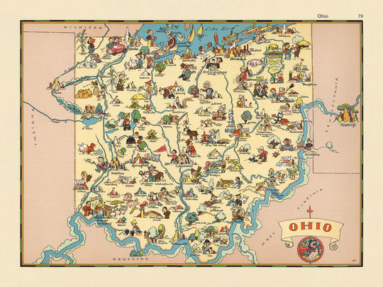 Step into the vibrant world of 1930s America with “Ohio,” an original pictorial map created by the celebrated Ruth Taylor White in 1935. This captivating cartographic gem, originally part of a whimsical atlas series, offers a delightful and insightful journey through the Buckeye State as seen through the eyes of a master illustrator. The map’s original title, simply “Ohio,” belies the exuberant artistry and storytelling that leap from every corner of its colorful surface. With its lively palette and playful, cartoon-like illustrations, the map invites viewers to experience the state’s unique character and cultural identity during a transformative era in American history.