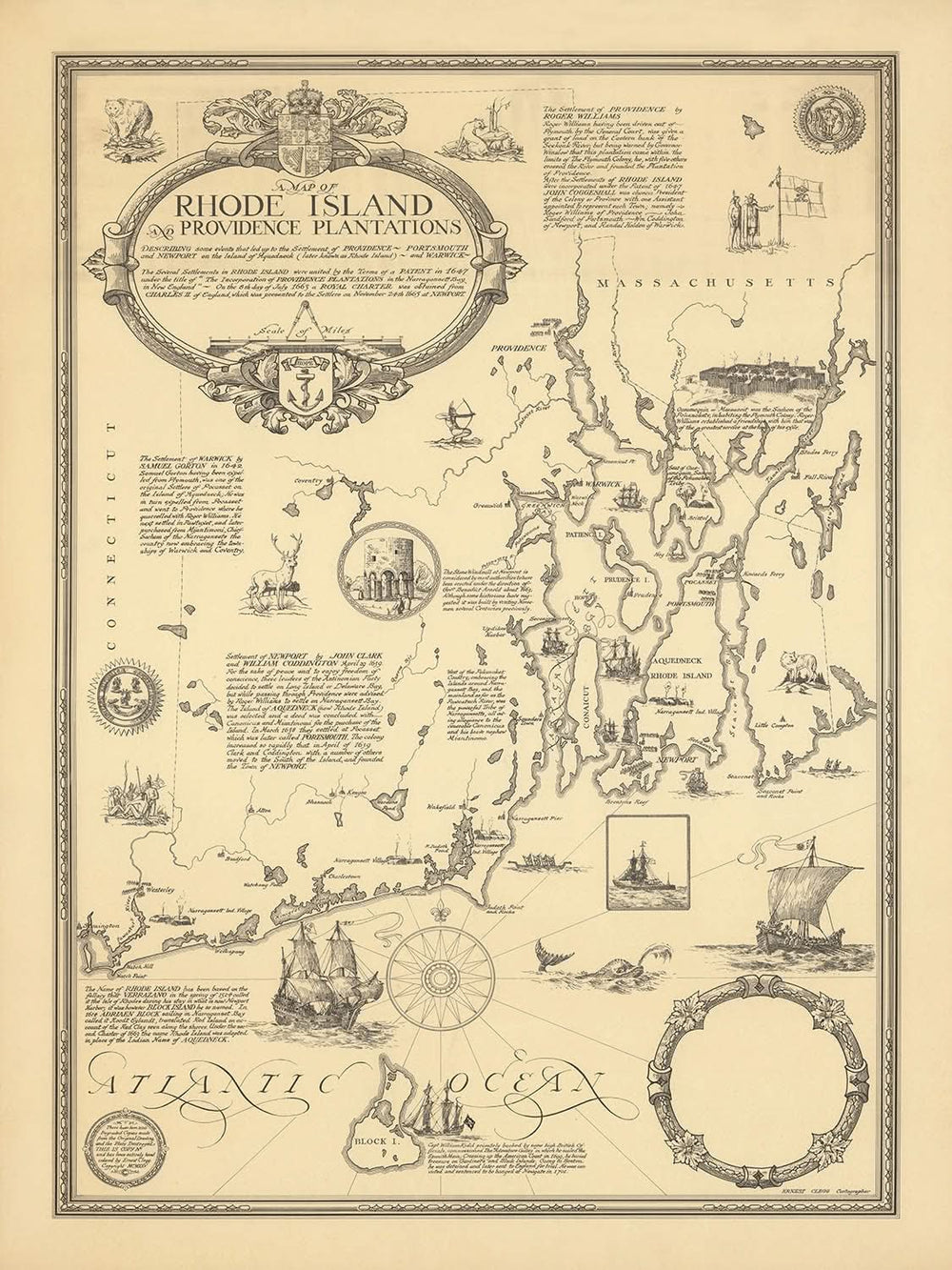 El mapa cubre la totalidad de Rhode Island, extendiéndose hacia partes de Massachusetts y Connecticut, con el Océano Atlántico bellamente representado a lo largo de su borde oriental. Muestra la costa detallada de Rhode Island, destacando sus bahías, ensenadas e islas. Un mapa insertado de Block Island agrega profundidad a la representación geográfica. El enfoque temático del mapa es evidente en la inclusión de anotaciones históricas y representaciones artísticas de figuras nativas americanas, asentamientos coloniales y primeros exploradores, ofreciendo una ventana al pasado.