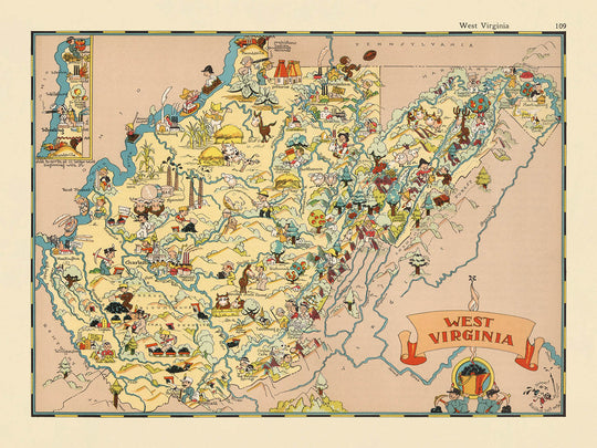 - Richly adorned with vibrant, cartoon-like images and illustrations that reflect the culture, industries, and stereotypes of West Virginia in the 1930s