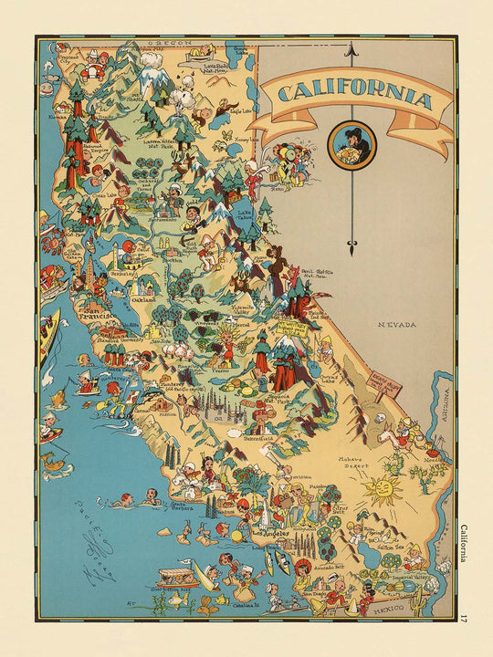 Step into the vibrant world of 1930s California with the captivating pictorial map, originally titled "California," crafted by the talented Ruth Taylor White in 1935. This map is more than a simple geographic rendering—it is a celebration of California’s regional character, rendered in a whimsical and visually arresting style that reflects the optimism and creative energy of its era. The map’s playful illustrations and lively colors invite viewers to explore the Golden State as it was imagined in popular culture, with each county and region brought to life through charming caricatures and iconic scenes.