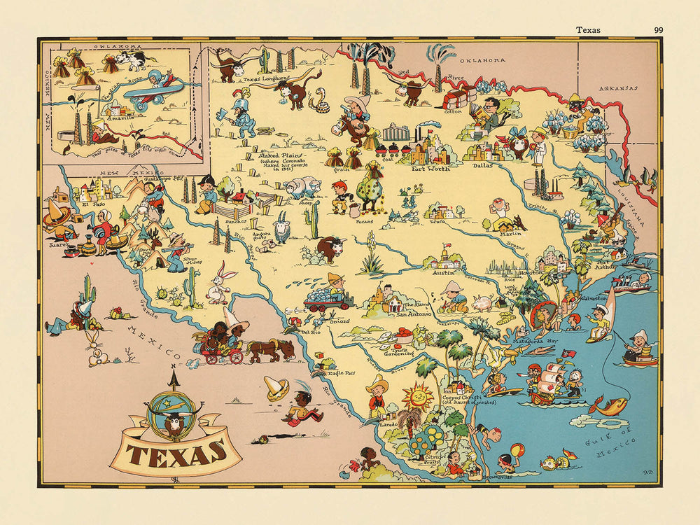 The map is a rich tapestry of Texas’s most iconic features and industries, capturing the essence of the state’s landscape and heritage. Dominating the visual narrative are images of cattle ranching, cowboys, and oil derricks—symbols of Texas’s economic might and rugged character. Cotton fields and agricultural scenes stretch across the plains, while the Gulf Coast is alive with maritime activity. The Rio Grande snakes along the southern border, and the state’s diverse geography is rendered in playful caricatures, from the rolling Hill Country to the arid deserts of the west.