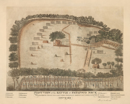 Sumérjase en un momento crucial de la historia de Estados Unidos con "First View of the Battle of Patapsco Neck Dedicated To Those Who Lost Their Friends In Defence of Their Country Septr. 12 1814" de Andrew Dulac, un fascinante grabado en cobre que data de 1814. Esta impresión artística de excepcional calidad ha sido cuidadosamente restaurada y preparada por The Unique Maps Co. y le ofrece la opción de personalizarla, lo que la convierte en una adición única a su colección.