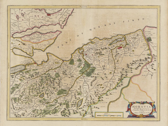 Este raro mapa en color de Inverness, Highlands y Moray (o Moravia en latín) de 1654 proviene del primer atlas de Escocia, Theatrum Orbis Terrarum de Jean Blaeu (latín para el Teatro del Orbe del Mundo). Fue coloreado a mano e impreso en pergamino. El cartógrafo de este mapa fue Timothy Pont.