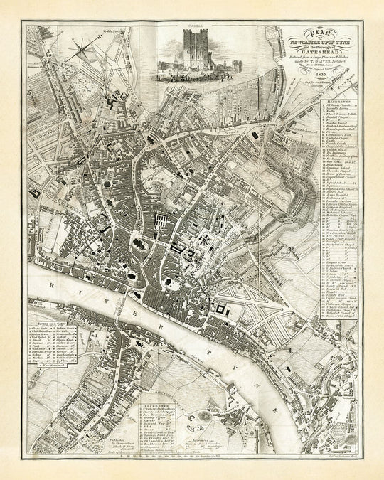 Este raro mapa antiguo de Newcastle upon Tyne y Gateshead fue creado por el topógrafo y arquitecto Thomas Oliver en 1830. Oliver estaba muy activo en ese momento y creó muchas encuestas y mapas de la zona.