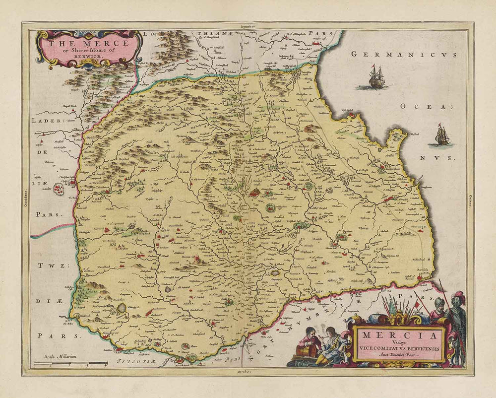 Este mapa antiguo de colores completos, extremadamente raro, del condado de Berwick en Escocia fue creado por el maestro cartógrafo Joan Blaeu desde su taller en Ámsterdam y publicado originalmente en 1665 como parte de su Theatrum Orbis Terrarum Sive Atlas Novus.