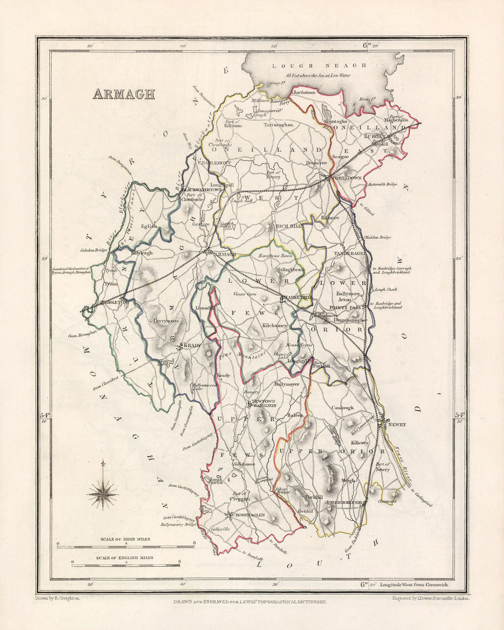 Poseer el mapa antiguo de Armagh de Samuel Lewis, 1844, le permite profundizar en la cautivadora historia del condado, explorar sus notables asentamientos y apreciar la belleza natural que ha dado forma a la región.