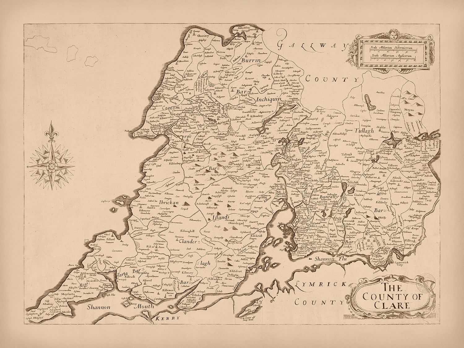 Mapa antiguo del condado de Clare por Petty, 1685: Castillo de Bunratty, Acantilados de Moher, The Burren, Loop Head, Kilrush