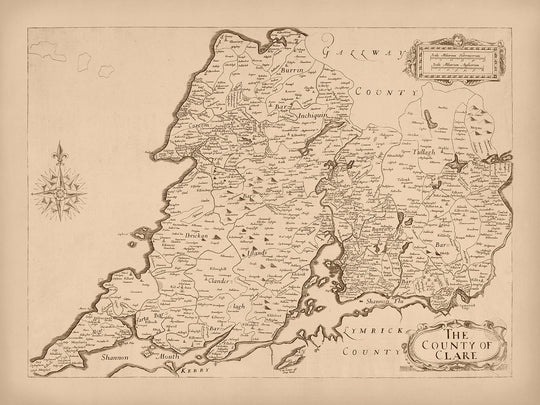 Este mapa del condado de Clare, publicado originalmente en 1685 por Sir William Petty, es un mapa político y físico detallado que proporciona una gran cantidad de información sobre el condado a finales del siglo XVII. El mapa se basa en el Down Survey de Irlanda, el primer estudio territorial detallado a escala nacional en cualquier parte del mundo, que se llevó a cabo entre 1656 y 1658. El mapa de Petty es una versión a escala reducida del Down Survey, pero aún así logra Capture el notable nivel de detalle que se logró en la encuesta original.