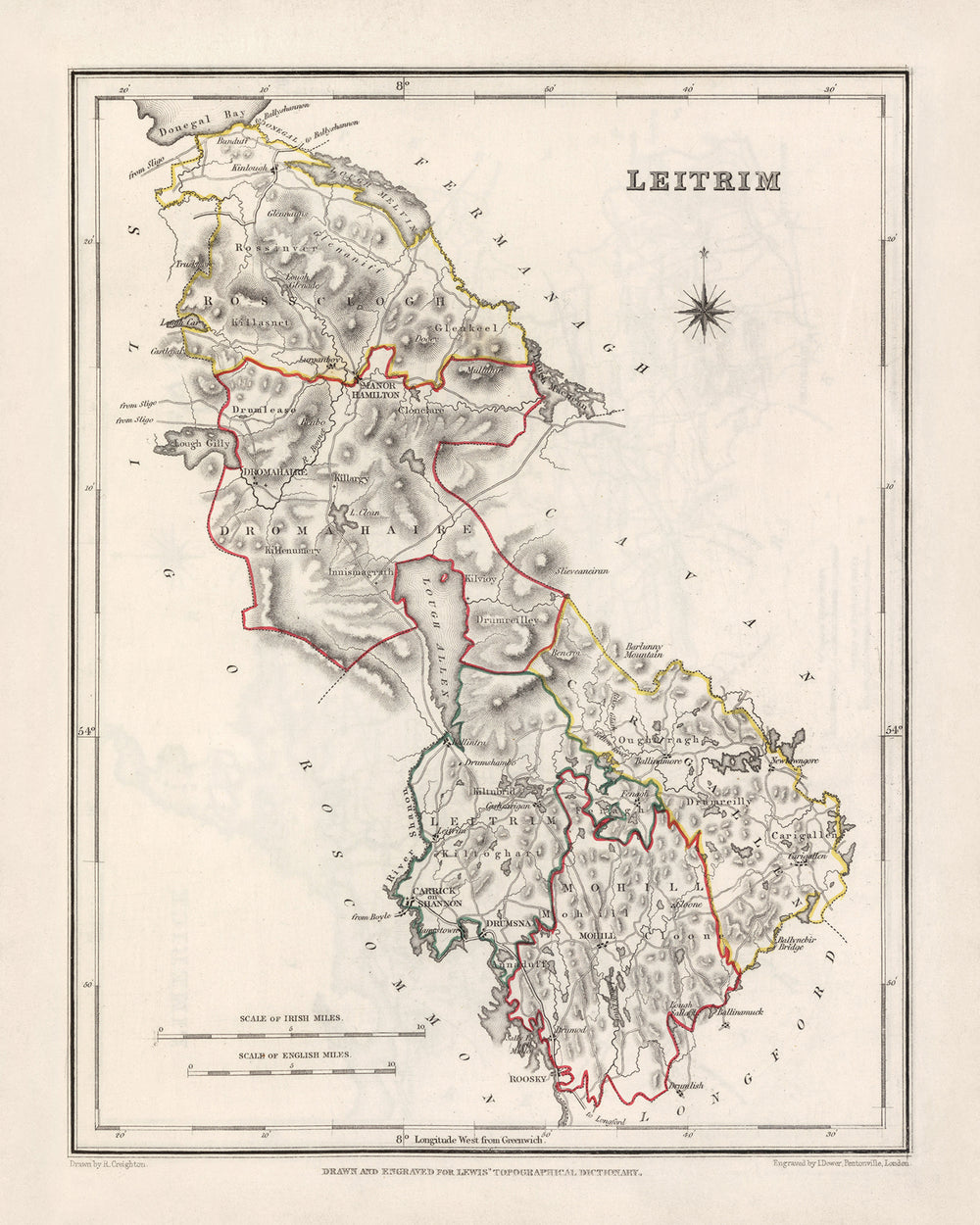 Mapa antiguo del condado de Leitrim por Samuel Lewis, 1844: Carrick-on-Shannon, Manorhamilton, Drumshanbo, Dromahair, Lough Allen