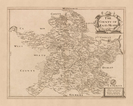 Este mapa del Condado de Meath, entonces Condado de East Meath, publicado originalmente en 1685 por Sir William Petty, es un mapa político y físico detallado que proporciona una gran cantidad de información sobre el condado y sus alrededores. El mapa se basa en el Down Survey de Irlanda, que fue la primera encuesta de tierras detallada a escala nacional en cualquier parte del mundo. El mapa de Petty es una versión a escala reducida del Down Survey original, pero aún así logra capturar una impresionante cantidad de detalles.
