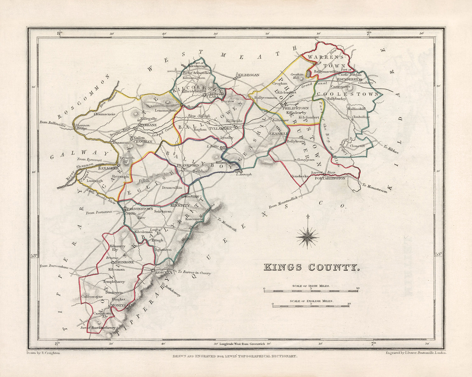 Mapa antiguo del condado de Offaly (King's) por Samuel Lewis, 1844: Tullamore, Birr, Banagher, Clara, Edenderry