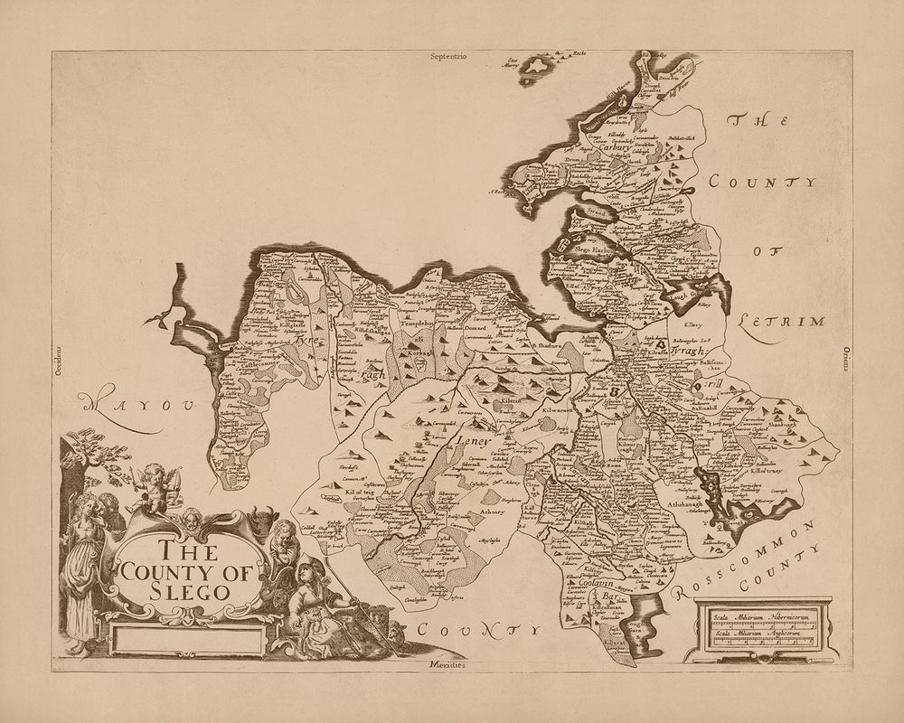 Antigua mapa del condado de Sligo por Petty, 1685: Boyle, Knocknarea, Lough Gill, Benbulben, montañas de Ox