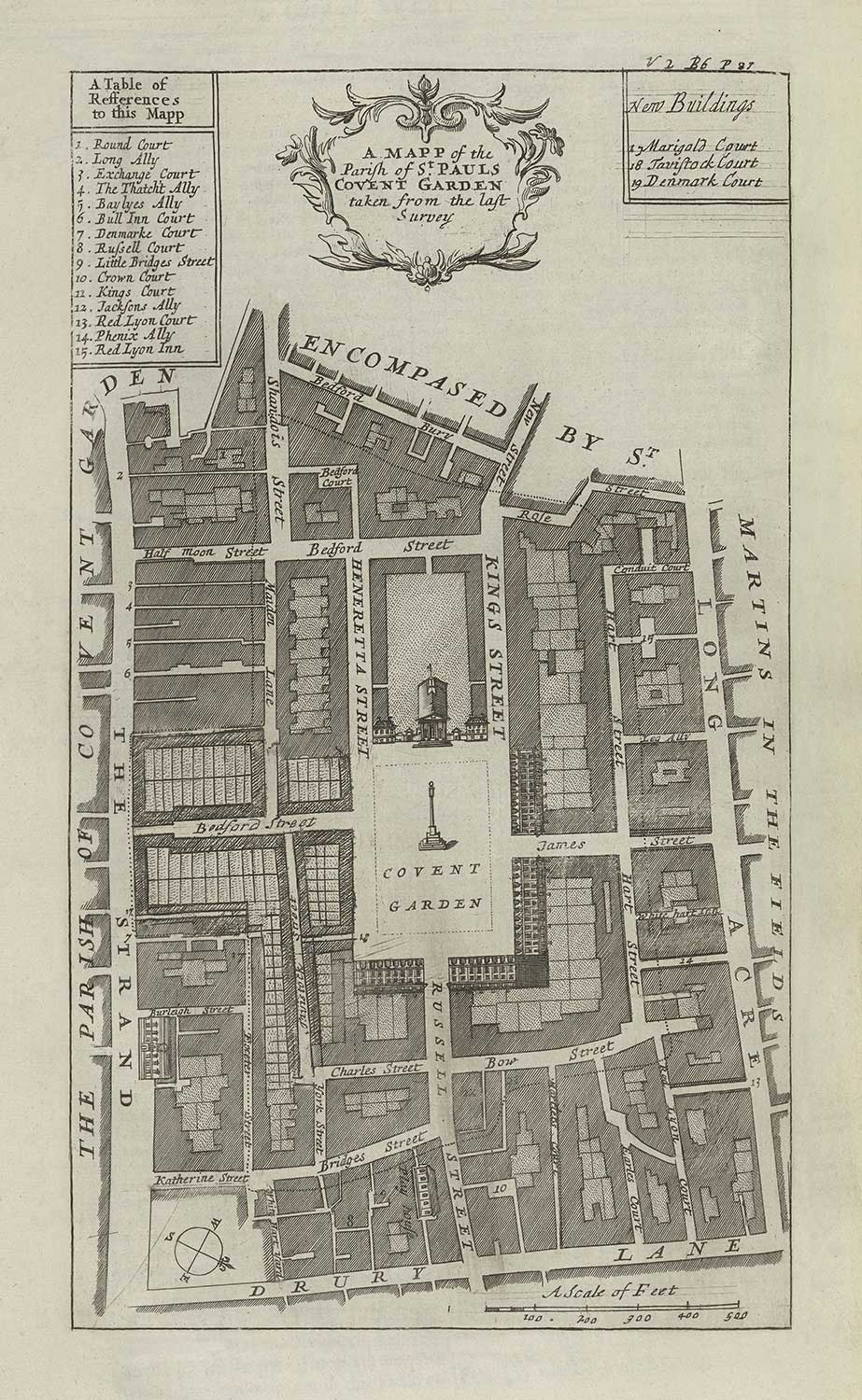 Este mapa de encuesta se centra principalmente en la Parroquia de St Pauls Covent Garden, donde puedes ver Kings Street así como Drury Lane en la parte inferior del mapa. Conocido hoy por sus tiendas, restaurantes, teatros y hogar de La Ópera Real y El Ballet Real, es una de las áreas más concurridas de Londres. En el siglo XVIII, la plaza o “piazza”, era donde todo, desde cafeterías hasta artistas callejeros y vendedores, sería prominente.
