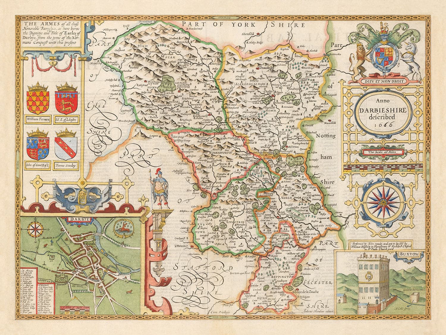 En la parte inferior izquierda hay un grabado detallado de Derby, la ciudad del condado. Gran parte del moderno Peak District está en este mapa, aunque en aquel entonces solo se llamaba Peake Forest.