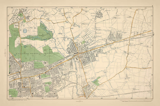El mapa también destaca hitos significativos y características naturales que han moldeado la identidad de la región. Wanstead Flats, una vasta extensión de terreno abierto, y West Ham Park, un querido espacio verde, están prominentemente representados, ofreciendo un vistazo a la vida recreativa de los londinenses. Bush Wood y el Cementerio de Manor Park añaden capas de intriga histórica, cada uno con sus propias historias que contar. Estos hitos no solo sirvieron como espacios comunitarios vitales, sino que también jugaron papeles clave en la evolución social y cultural del área.