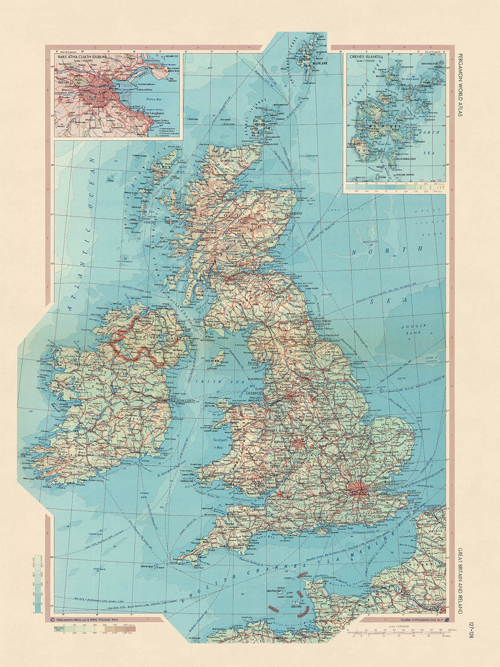 Este mapa de 1967 de Gran Bretaña e Irlanda elaborado por el Servicio de Topografía del Ejército Polaco es un mapa político y físico detallado que proporciona una descripción completa de las Islas Británicas. El mapa está centrado en las Islas Británicas, y los países circundantes de Francia, Bélgica, los Países Bajos, Dinamarca, Noruega, Suecia e Islandia se muestran en mapas insertados. El mapa también incluye recuadros detallados de Dublín (Baile Atha Cliath) y las Islas Orcadas.