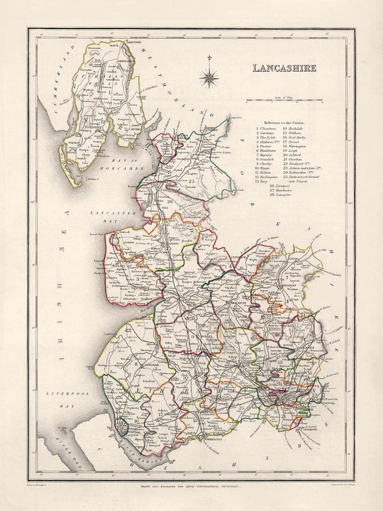 Adéntrate en un mundo que entrelaza una rica historia y la artesanía cartográfica con este exquisito mapa de Lancashire de 1844, meticulosamente elaborado por Samuel Lewis. Más allá de su impresionante detalle y superbia precisión, este mapa ofrece una instantánea única de una era pasada, mostrando asentamientos en su desarrollo temprano, algunos de los cuales llevan nombres que desde entonces han cambiado. El Lancashire del pasado cobra vida en este mapa, un recordatorio de la notable evolución de nuestras ciudades, pueblos y aldeas, y del paisaje humano en constante cambio.