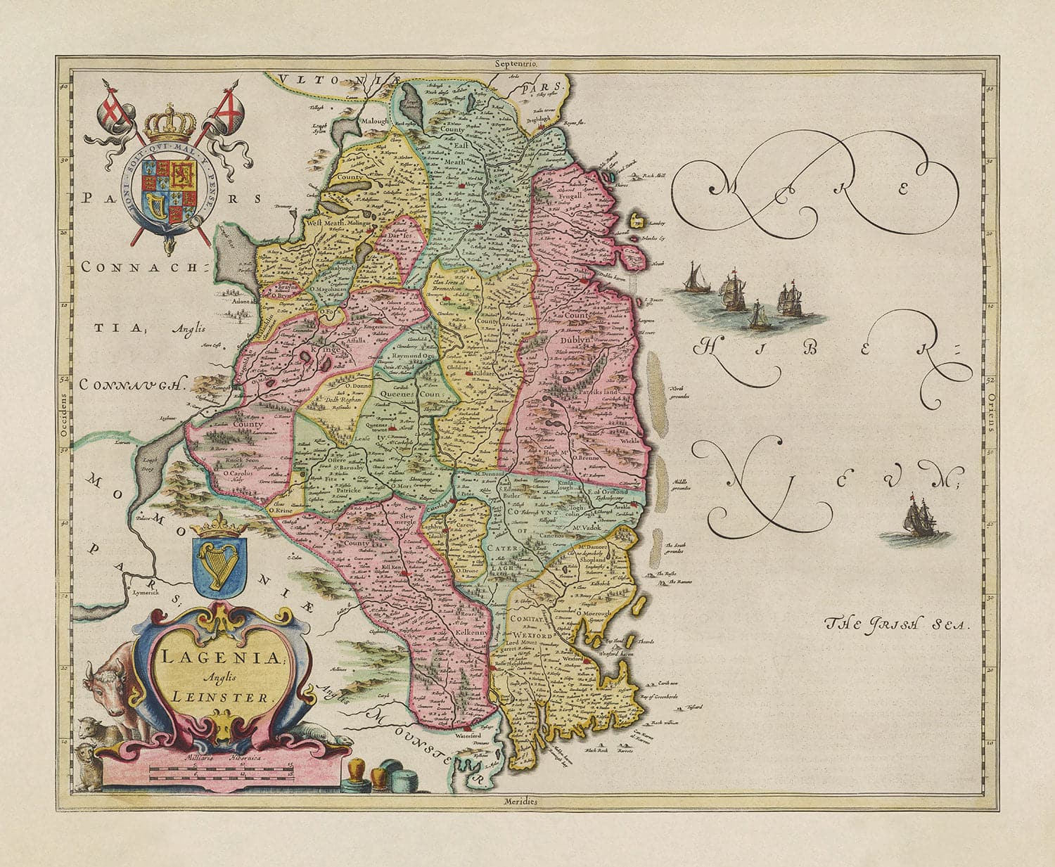 Mapa antiguo de Leinster, Irlanda en 1665 por Joan Blaeu: Condado de Dublín, Kilkenny, Meath, Drogheda Swords, Waterford, East Eire