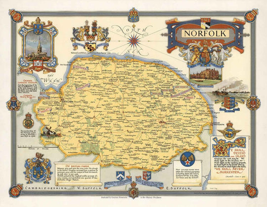 Antiguo mapa de Norfolk por Ernest Clegg, 1945: Sandringham, Norwich, Yarmouth, Winston Churchill, Lord Nelson, WW2