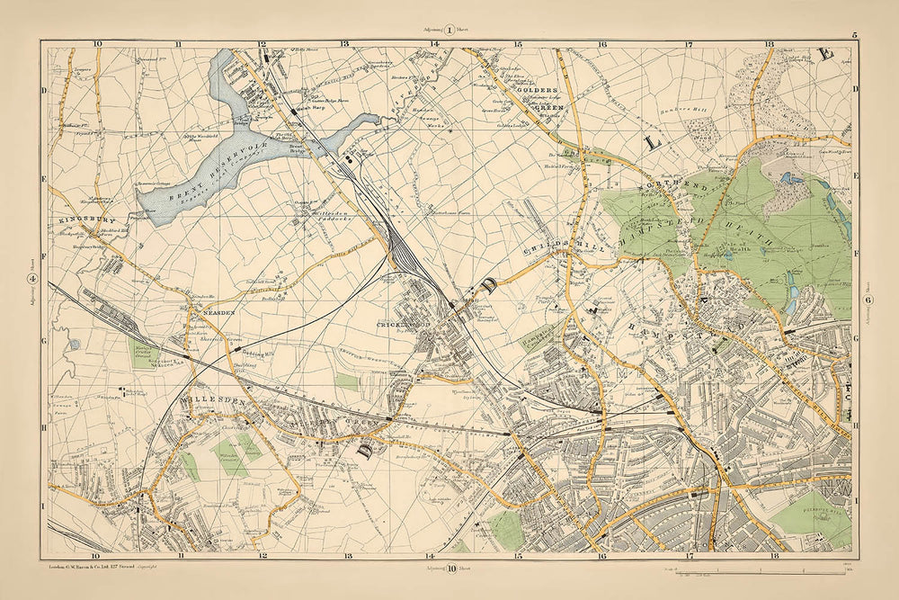 El mapa destaca vecindarios significativos como Kingsbury, Willesden y el pintoresco Hampstead, cada uno ofreciendo una ventana única al pasado. Kingsbury, con sus raíces históricas, se encuentra junto a la más urbanizada Willesden, mostrando la diversidad de desarrollo durante esta era. La inclusión de Golders Green y Cricklewood enfatiza aún más la rápida expansión y la fusión de paisajes rurales y urbanos que caracterizaron este período en la historia de Londres.