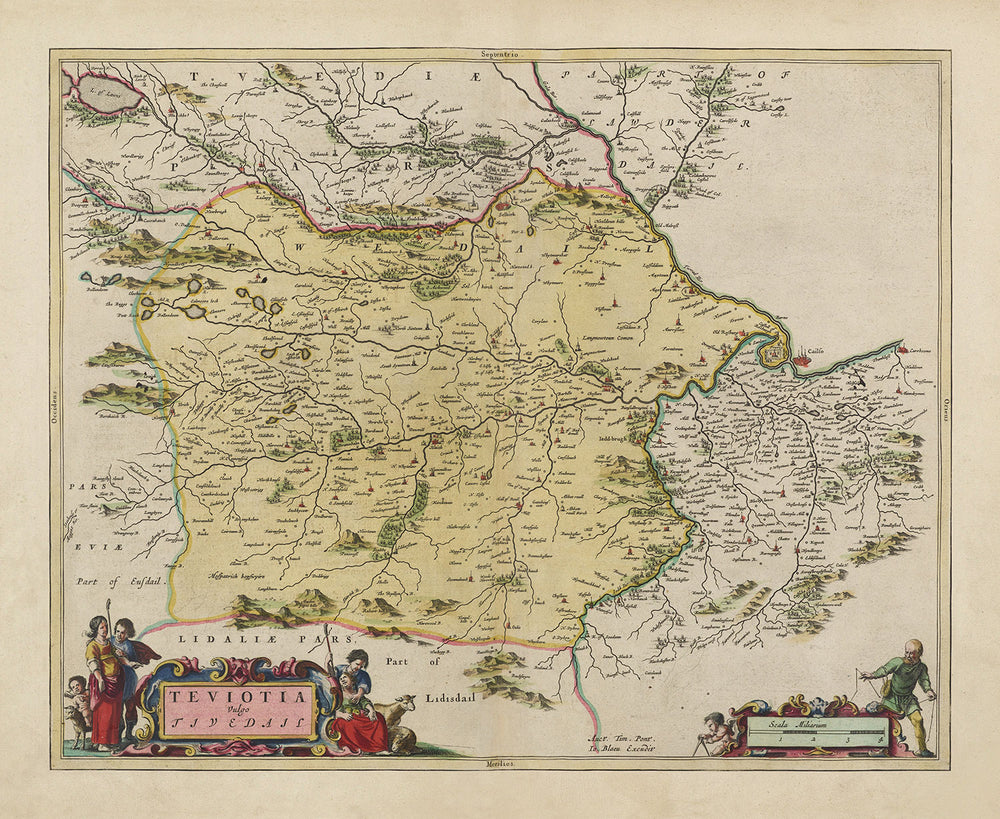 Este mapa antiguo de colores completos, extremadamente raro, del condado de Roxburgh en Escocia fue creado por el maestro cartógrafo Joan Blaeu desde su taller en Ámsterdam y publicado originalmente en 1665 como parte de su Theatrum Orbis Terrarum Sive Atlas Novus.