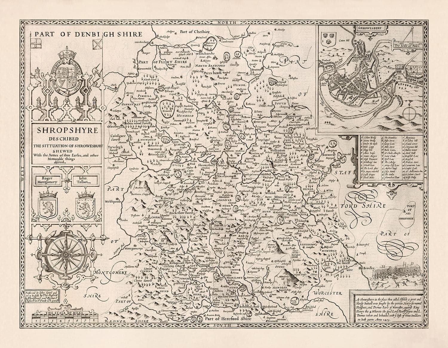 Mapa antiguo de Shropshire en 1611 por John Speed ​​- Shrewsbury, Telford, Bridgnorth, Oswestry, Newport, Ludlow