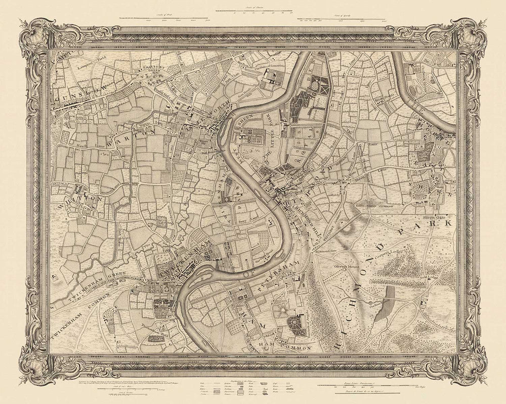 Antiguo mapa del suroeste de Londres en 1746 por John Rocque: Twickenham, Isleworth, Richmond Park, Hounslow, Whitton, SW14, TW1, TW2, TW4
