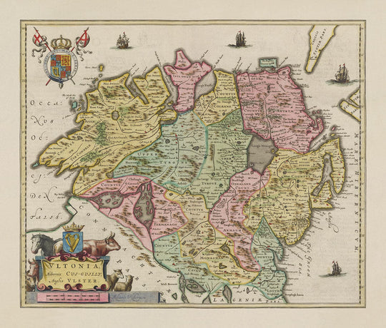Este es un mapa antiguo de colores completos de la antigua provincia irlandesa de Ulster, creado por el maestro cartógrafo Joan Blaeu desde su taller en Ámsterdam y publicado originalmente en este Theatrum Orbis Terrarum Sive Atlas Novus en 1665.