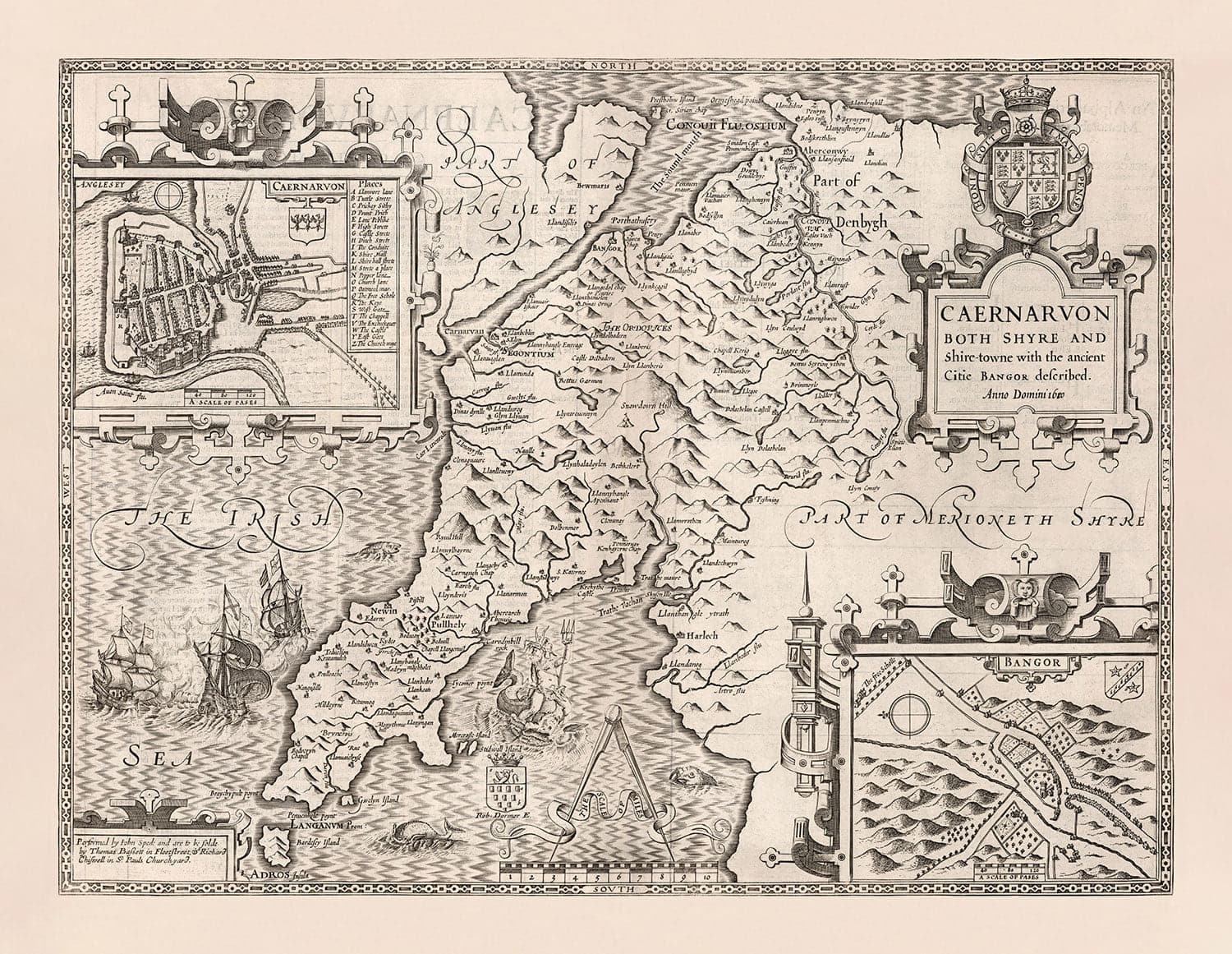 Antigua mapa monocromático de Caernarfonshire, Gales, 1611 por John Speed: Caernarfon, Snowdon, Gwynedd, Bangor, Conwy, Llandudno