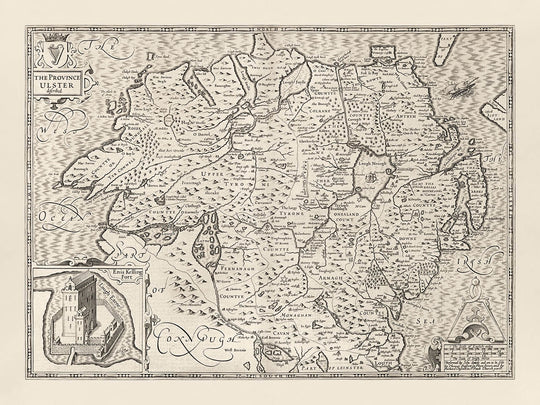 Mapa monocromático antiguo de Ulster, Irlanda del Norte en 1611 por John Speed - Belfast, Derry (no Londonderry), Condado Antrim y Down