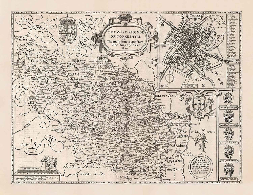 Antiguo mapa monocromo de West Yorkshire, 1611 por John Speed: York, Bradford, Sheffield, Leeds, Huddersfield, Harrogate, Skipton
