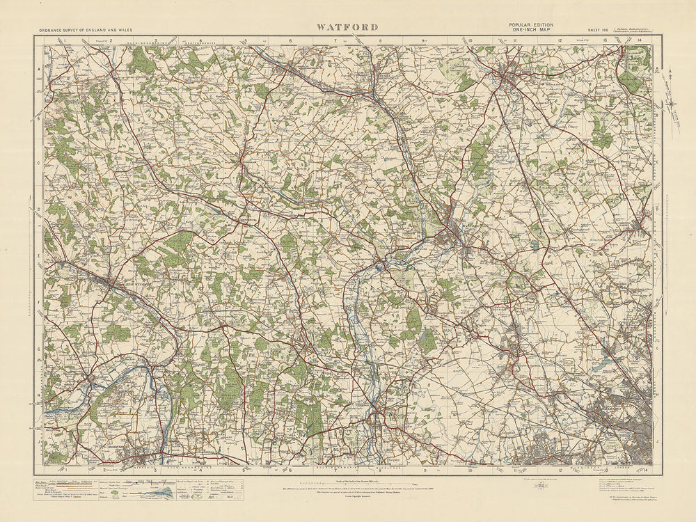 Este mapa antiguo, titulado "Hoja 106 - Watford", es una pieza notable de la edición "Popular" de una pulgada de Inglaterra y Gales de Ordnance Survey, publicada en 1925. El mapa muestra varios pueblos y ciudades destacados y características fascinantes, incluida St. Albans, Hemel Hempstead, High Wycombe, Maidenhead y el pintoresco parque regional Clne Valley.