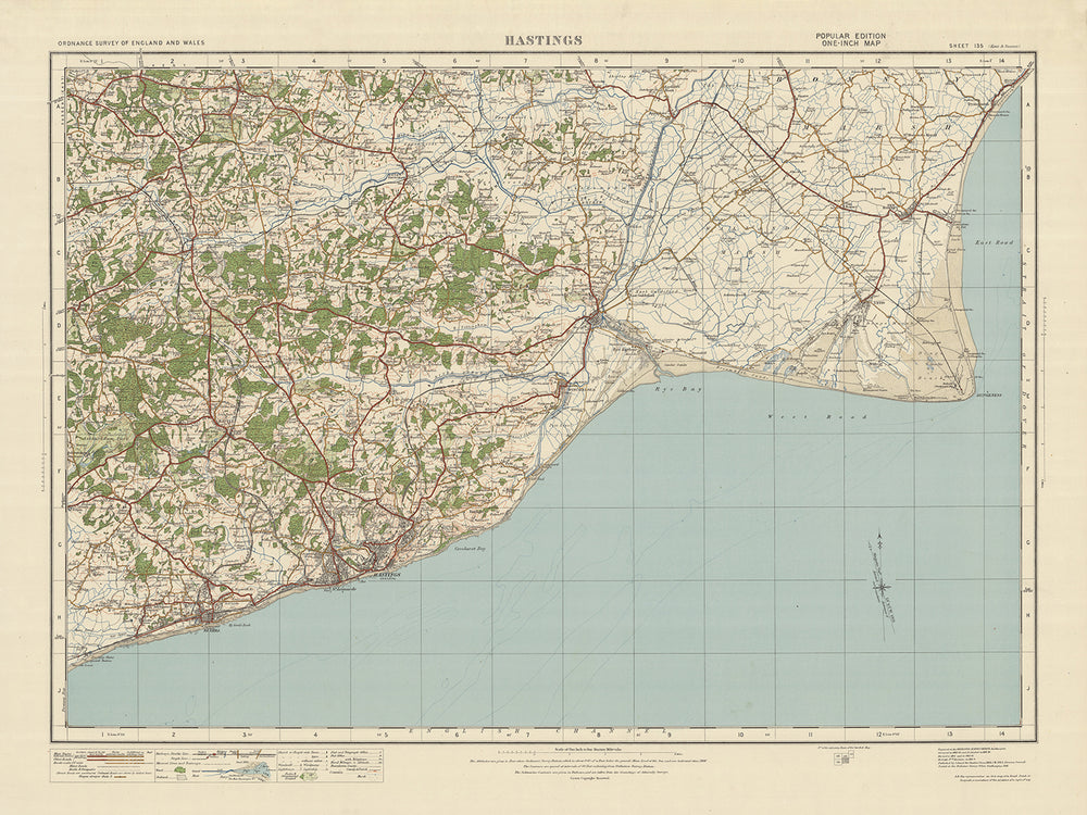 El mapa "Hoja 135 - Hastings" de la edición "Popular" de una pulgada de Ordnance Survey, publicada en 1925, es una pieza fascinante de la historia cartográfica que ofrece una mirada al pasado. Este mapa meticulosamente detallado muestra los pueblos, ciudades y características interesantes de la región, incluidos Hastings, Bexhill, Rye, Battle, Lydd y la pintoresca zona de excepcional belleza natural de High Weald (AONB).