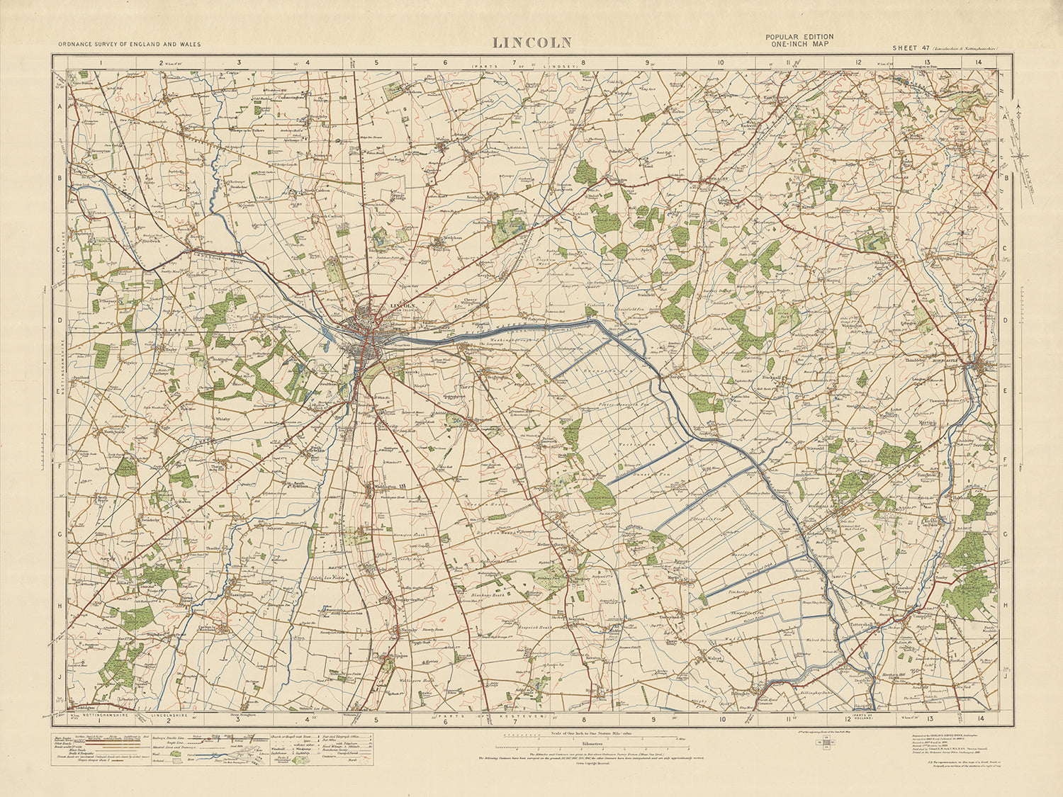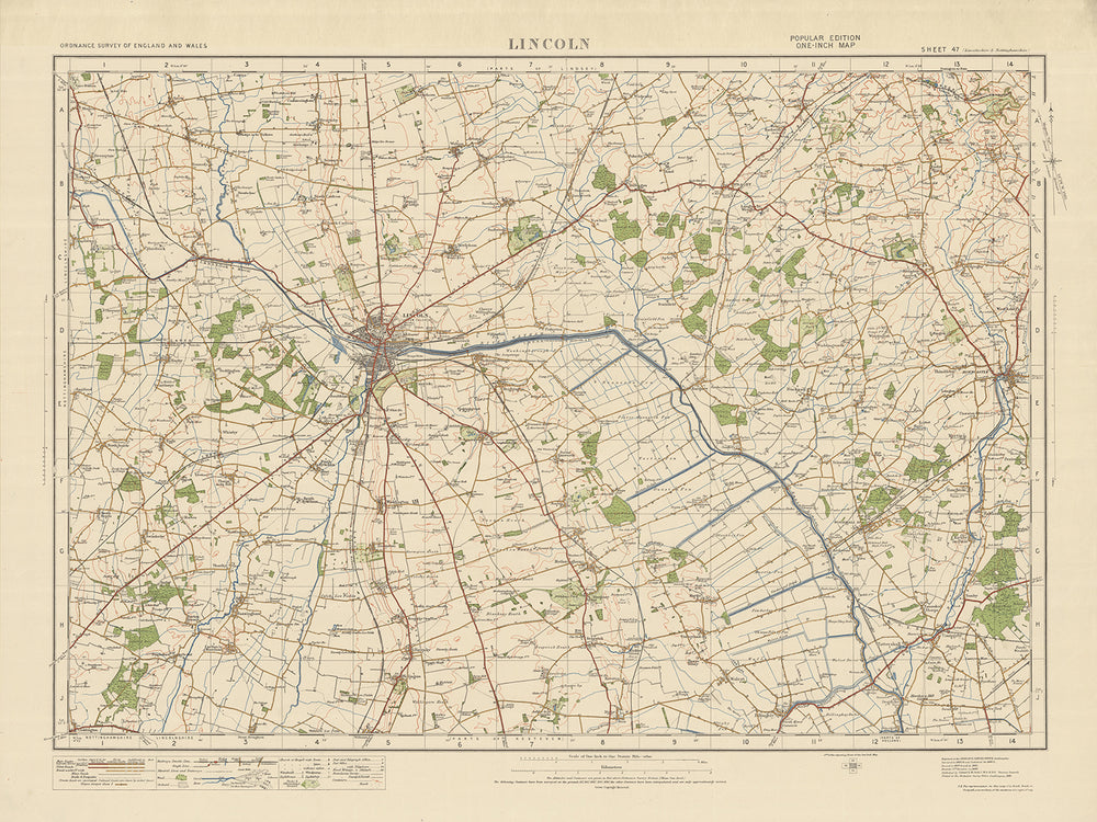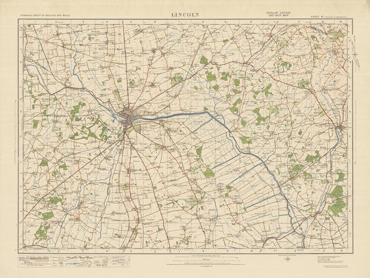 El mapa "Hoja 47 - Lincoln" de la edición "Popular" de una pulgada de Ordnance Survey, Inglaterra y Gales, publicada en 1925, es una pieza extraordinaria de la historia cartográfica. Este mapa meticulosamente detallado muestra la ciudad de Lincoln y sus alrededores, brindando una visión fascinante del pasado. Además de Lincoln, este mapa presenta varias ciudades y ubicaciones notables, incluidas Horncastle, Woodhall Spa, Wragby, North Hykeham y Metheringham.