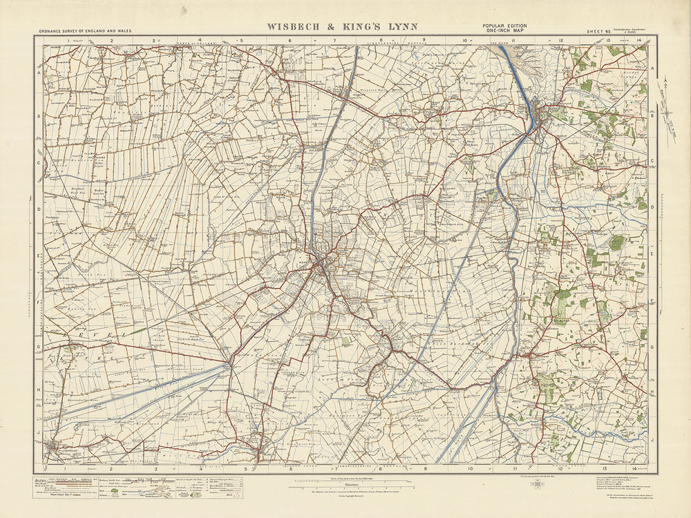 Este antiguo mapa de Ordnance Survey, Hoja 65 - Wisbech & Kings Lynn, es una pieza fascinante de la historia cartográfica de la edición "Popular" de una pulgada de Inglaterra y Gales, publicada en 1925. El mapa muestra las ciudades de Wisbech & Kings Lynn, junto con varios otros asentamientos y características notables en el área circundante.