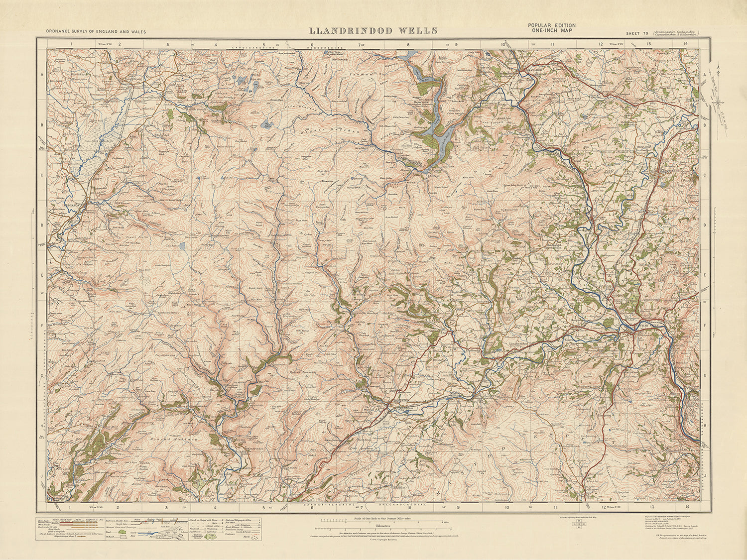 Mapa de estudio de artillería antigua, hoja 79: Llandrindod Wells, 1925: Builth Wells, Rhayader, Llanwrtyd Wells, Tregaron, Elan Valley
